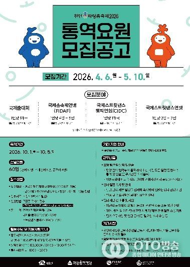 안동순 천안문화재단 대표이사는 “통역요원은 단순지원 인력을 넘어 축제의 글로벌 경쟁력을 높이는 핵심 역할”이라며 “국제 무대에서 역량을 펼치고 싶은 청년들의 적극적인 참여를 기대한다”고 말했다.