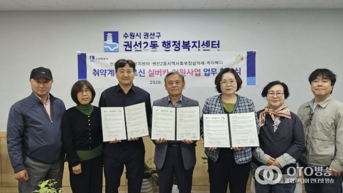 oto방송 김민석 기자 | 수원시 권선구 권선2동은 지난 23일, 권선2동 지역사회보장협의체, 케이메디와 취약계층 어르신의 안전한 이동 지원과 삶의 질 향상을 위한 “실버카(보행보조기) 지원사업 업무협약(MOU)”을 체결했다.