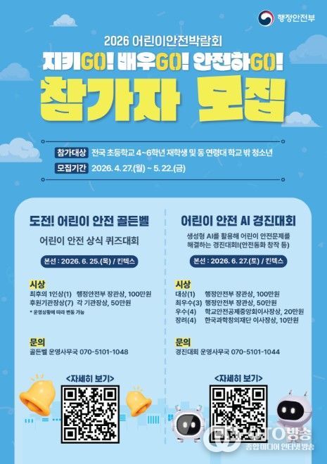 oto방송 김민석 기자 | 행정안전부는 6월 25일부터 27일까지 경기도 고양시 킨텍스(KINTEX)에서 ‘2026 어린이안전박람회’를 개최한다. 올해 박람회는 ‘지키GO! 배우GO! 안전하GO!’를 표어로, 어린이가 올바른 안전의식과 습관을 익힐 수 있도록 다양한 체험 활동으로 구성했다.
