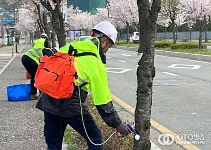 oto방송 김민석 기자 | 화성특례시 만세구는 최근 증가하는 식엽성 해충 피해에 대응하기 위해 주요 벚나무길을 중심으로 수간주사 방제를 실시했다고 27일 밝혔다.