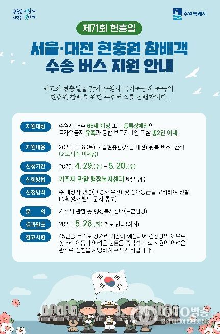 oto방송 김민석 기자 | 수원특례시가 제71회 현충일인 6월 6일, 국립현충원(서울·대전)까지 이동이 여의치 않은 국가유공자 유족을 위해 현충원 왕복 수송버스를 운행한다.