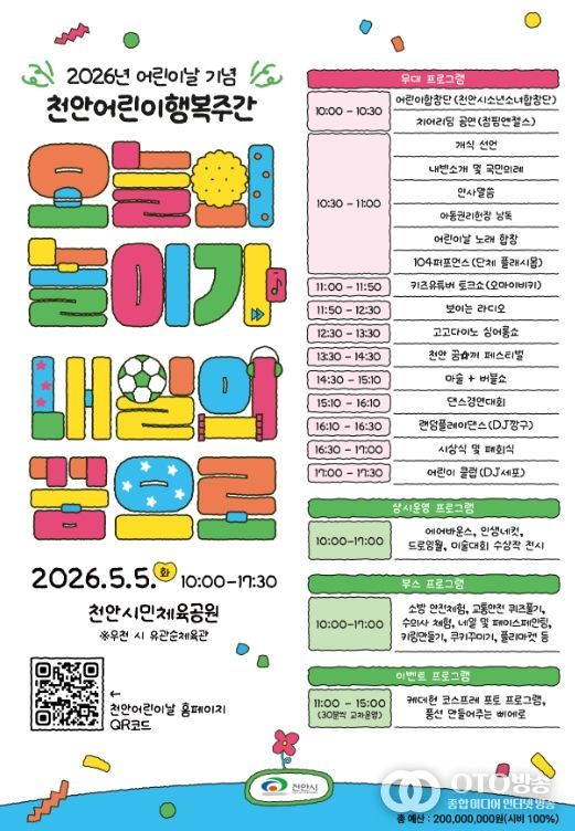 oto방송 김민석 기자 | 천안시는 제104회 어린이날을 맞아 5월 1일부터 5일까지 ‘2026 천안어린이 행복주간’을 운영한다고 28일 밝혔다.