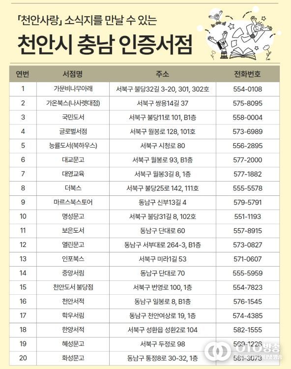 천안사랑이 비치된 서점 목록은 천안시 도서관 누리집에서 확인할 수 있다. 소식지는 카카오톡 채널 ‘천사통’과 모바일 앱으로 제공되며, 시청 누리집에서 우편 무료 구독 신청도 가능하다.