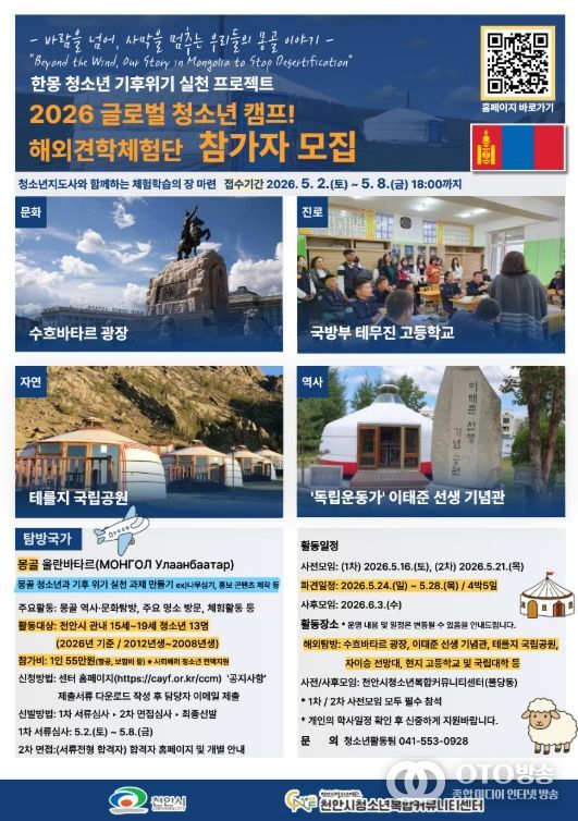 oto방송 김민석 기자 | 천안시청소년재단 산하 천안시청소년복합커뮤니티센터가 청소년의 글로벌 역량 강화를 위해 ‘2026 청소년 국제교류 캠프’ 몽골 탐방 참가자를 모집한다.