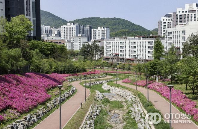oto방송 김민석 기자 | 의왕시 백운밸리 지역의 생태 소하천 ‘바라천’이 봄을 맞아 화사한 철쭉(자산홍)으로 물들었다. 총길이 약 1km에 이르는 이 산책로에는 분홍빛 철쭉이 줄지어 피어나며 방문객들에게 아름다운 풍경을 선사하고 있다.