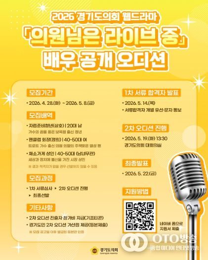 oto방송 김민석 기자 | 경기도의회는 2026년도 경기도의회 웹드라마 ‘의원님은 라이브 중(가제)’에 출연할 배우를 공개 모집하기 위해 오디션을 개최한다.