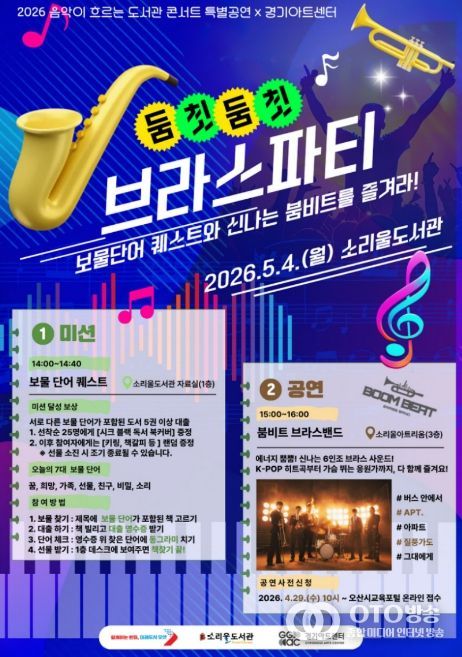 oto방송 김민석 기자 | 오산시 소리울도서관은 제104회 어린이날을 앞둔 오는 5월 4일 경기아트센터와 협업해 ‘2026 음악이 흐르는 도서관 콘서트’ 특별공연인 ‘둠칫둠칫 브라스 파티’를 개최한다고 밝혔다.