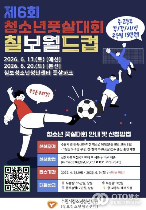 oto방송 김민석 기자 | 수원시청소년청년재단 칠보청소년청년센터는 오는 6월 13일(예선)과 20일(본선), 양일간 센터 내 풋살파크에서 녪. 청소년 풋살대회 [제6회 칠보월드컵]’을 개최한다고 밝혔다.