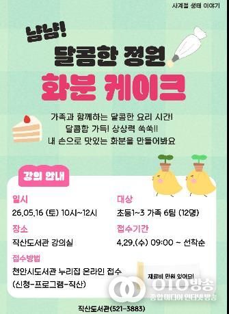 oto방송 김민석 기자 | 천안시 직산도서관은 내달 16일 ‘냠냠! 달콤한 정원, 화분 케이크’를 운영한다고 29일 밝혔다.