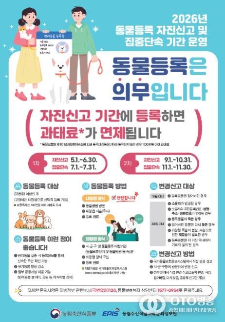oto방송 김민석 기자 | 농림축산식품부는 5월부터 7월까지 동물등록 미등록자 및 미신고자를 대상으로 동물등록 자진신고 및 집중 단속기간을 운영한다.