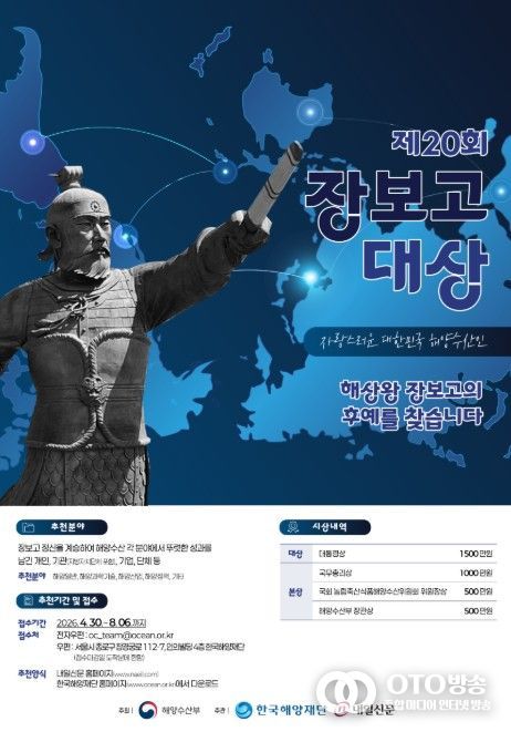 oto방송 김민석 기자 | 해양수산부는 4월 30일부터 8월 6일까지 ‘제20회 장보고대상’ 후보자를 공모한다고 밝혔다.