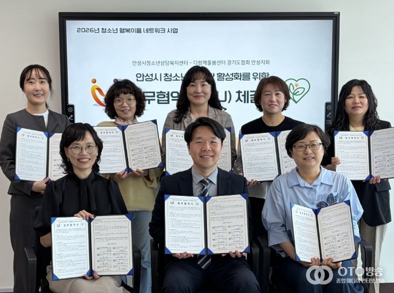 oto방송 김민석 기자 | 안성시청소년상담복지센터는 지난 27일 안성맞춤공감센터에서 다함께돌봄센터 경기도협의회 안성지회와 청소년의 건강한 성장과 복지 증진을 위한 업무협약(MOU)을 체결했다.