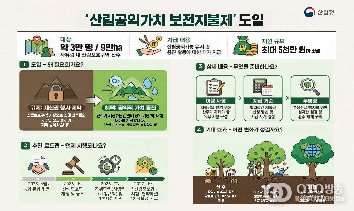 ‘산림보전지불제’는 산주가 시‧도지사와 산림보호 협약을 체결 후 산림보호구역의 공익기능 유지‧증진을 위한 활동에 참여하면 그 비용을 ‘산림공익가치 보전지불금’으로 지급 받을 수 있는 지원체계로, 2027년부터 관련 예산을 확보해 시범사업*을 추진하고 점차 확대할 계획이다.