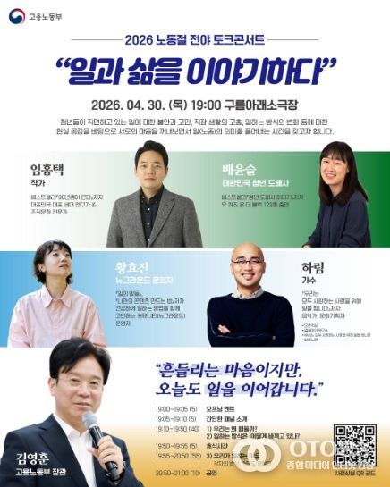 oto방송 김민석 기자 | 고용노동부는 4월 30일 저녁 7시, 서울 마포구 소재 ‘구름아래소극장’에서 청년 200여 명과 함께 일에 대한 고민을 나누며, 노동의 가치를 다시 한번 생각해 보는'일과 삶을 이야기하다' 토크콘서트를 개최했다고 밝혔다.