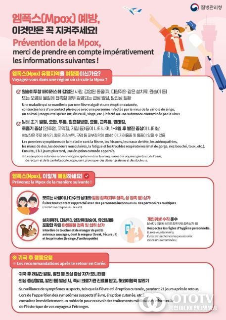 지영미 질병관리청장은 “엠폭스 변이바이러스의 유입 차단을 위해서는 해외 여행 시 예방수칙을 준수하는 것이 중요하다”고 강조하면서, “해외 여행 시 모르는 사람과의 안전하지 않은 밀접 접촉(피부·성)을 피하고 설치류, 영장류 같은 야생동물과의 접촉 및 섭취를 삼가야 하며, 엠폭스 의심 증상이 있는 사람이 사용한 수건, 식기 등의 물품은 만지지 말고, 손씻기 등 기본적인 개인위생수칙을 준수해 줄 것”을 당부했다.